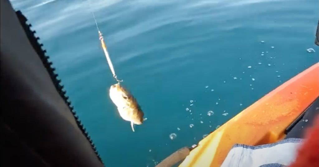 なんと一投目から当たりがありワクワクして巻くと「フグ」でした。久しぶりの魚だったんでフグでも嬉しかったんですが、2回目以降はイラつきましたね(笑)
